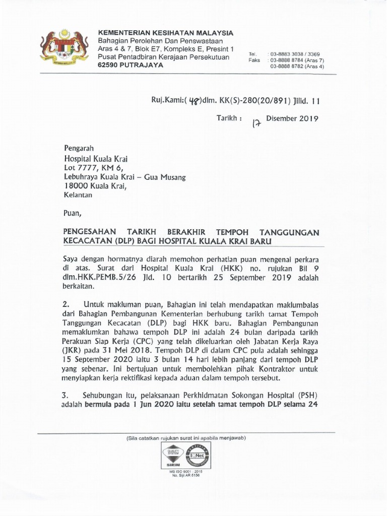 48665 Kepada Park Life City di Sri Hartamas Kuala Lumpur 2 Pembangunan Tanah Milik Kementerian Komunikasi dan Multimedia di Petaling Jaya 3 Pembangunan Penswastaan Usahasama dengan Datuk Bandar di atas Lot 316 dan Lot 20002 Kuala Lumpur oleh Montflex Sdn Bhd 4 Pembinaan Balai Bomba. Menjalankan Pemantauan ke atas perjalanan kerja-kerja penyelenggaraan bangunan sistem pepasangan loji dan peralatan jentera mekanikal elektrikal dan biomedikal semasa Tempoh Tanggungan Kecacatan DLP bagi Hospital. Menilai keberkesanan perlaksanaan secara menyeluruh Penswastaan Perkhidmatan sokongan Hospital dalam mematuhi perjanjian konsesikontrak bagi kelima-lima perkhidmatan berikut.