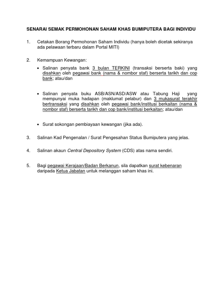 Senarai Semak Permohonan Saham Khas Bumiputera Individu Pdf