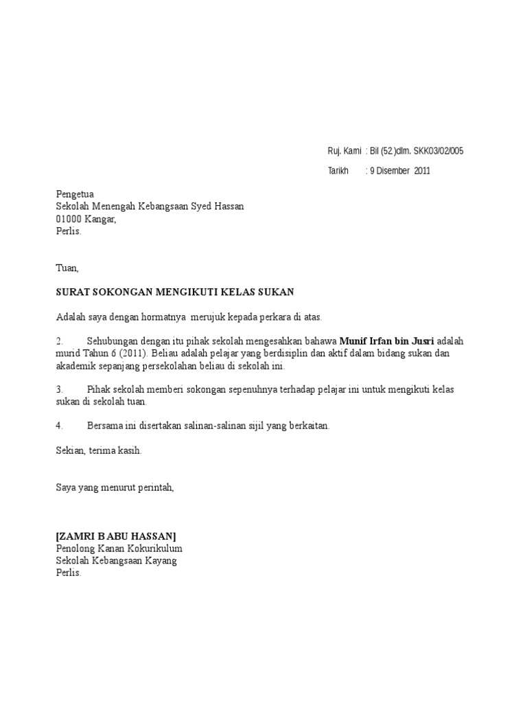 SURAT SOKONGAN PENGETUA Letterhead sekolah Rujukan Kami. Setelah surat permohonan dihantar cara untuk meninggikan peluang mendapat tempat di Maktab Sultan Abu Bakar ialah hadir bersama ibu bapa untuk berjumpa dengan pengetua MSAB dan membawa bersama satu surat sokongan dari ADUN atau cara yang setara. Jika dapat sokongan PengetuaGuru Besar adalah lebih baik.