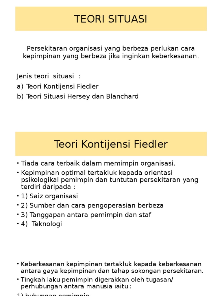 Keputusan kajian juga telah menunjukkan bahawa terdapat hubungan signifikan antara gaya kepimpinan pengetua berdasarkan persepsi guru dengan motivasi guru r 038 p 05. Dominan berdasarkan persepsi guru di SMK harian Kluang Johor adalah gaya kepimpinan berbentuk sokongan manakala motivasi guru berada pada tahap sederhana. Tuntutan Persekitaran Saiz organisasi bgmana pemimpin menyesuaikan diri dgn persekitaran.
