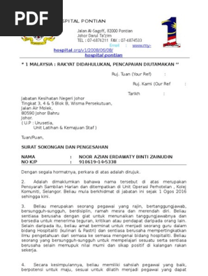 Di sini kami kongsikan secara ringkas contoh surat pengesahan majikan dan jawatan. Oleh itu permohonan SPP perlu dibuat menerusi Industrial Training System ITS. Contoh Surat Sokongan Hospital Azuazuri.
