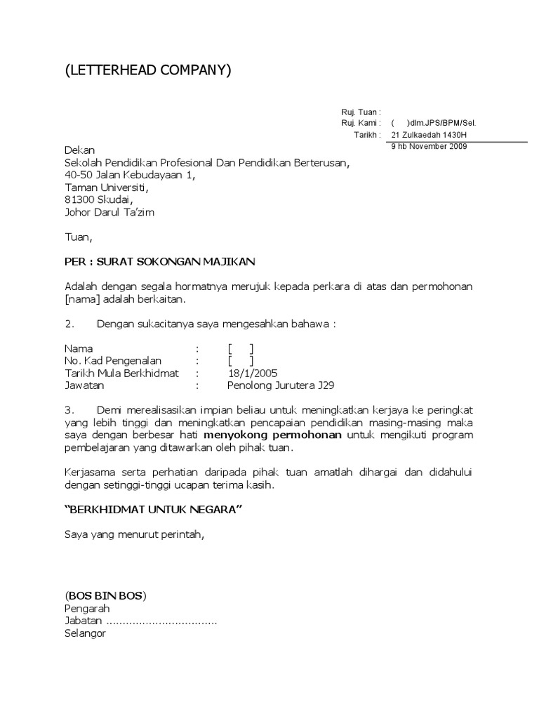 Lihat juga tentang sokongan dan contoh surat sokongan sekolah JBA 1024 Faks. Contoh Surat Sokongan Majikan Untuk Sambung Belajar. Contoh Surat Gagal Temuduga Untuk makluman menerusi portal spa temuduga jawatan pustakawan di perpustakaan negara malaysia akan dijalankan pada Contoh Surat Rasmi Memohon Temujanji.